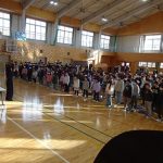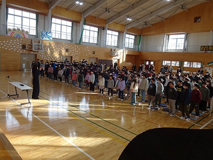 体育館に全校が集まり、始業式を行いました。校長先生から「目標を持ってがんばろう」「短い学期ですが次の学年に向けて準備をしよう」という話がありました。2年生と6年生の代表による作文発表では、冬休み中に親戚と過ごした貴重な体験や、3学期にがんばりたいことを堂々と伝えてくれました。